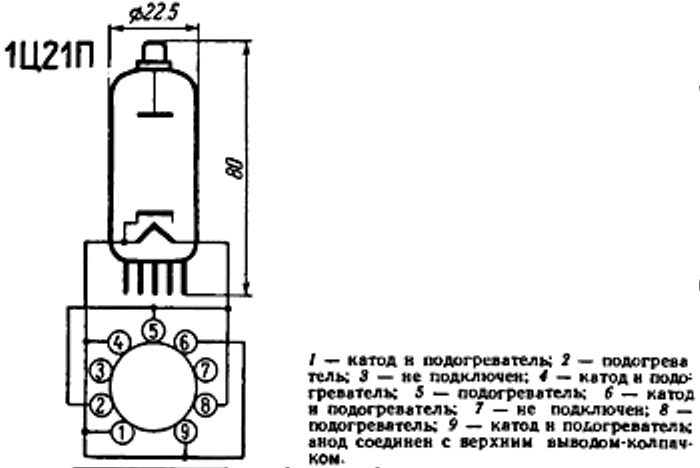 Высоковольтный кенотрон 1Ц21П с оксидным катодом косвенного накала.